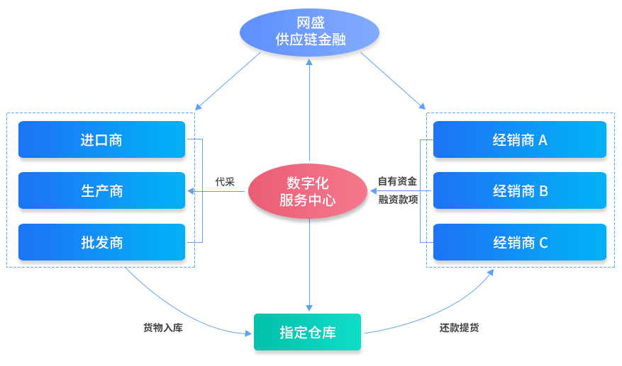 對供應鏈單個企業或上下游多個企業提供全面交易、金融等服務。 網盛供應鏈金融是依托網盛數字化交易平臺及供應鏈金融平臺,為